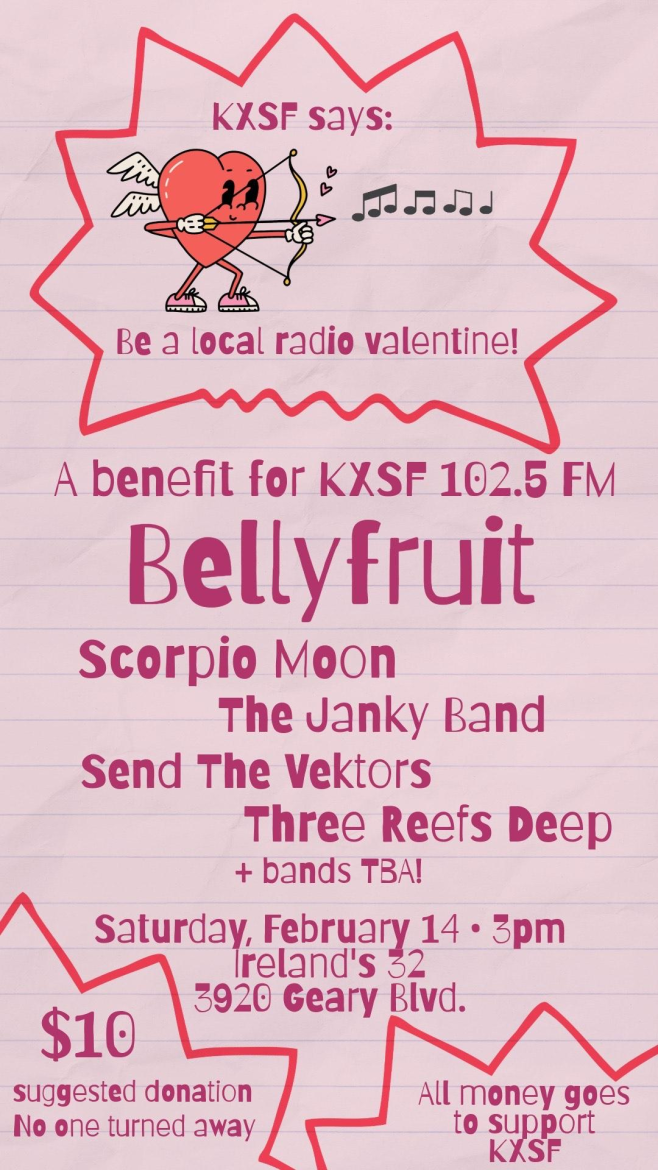 Come on out and support KXSF 102.5 FM by celebrating Damin’s 60th birthday! What? Holy crap! The party runs 3-11 p.m. on Sat. Feb. 14 at Ireland’s 32 (3920 Geary, San Francisco). A suggested donation of $10 gets you in to see six bands including Bellyfruit, Scorpio Moon, Three Reefs Deep, The Janky Band and Send the Vektors. More may be added! Join in the fun and support your favorite local community radio station, KXSF 102.5 FM!